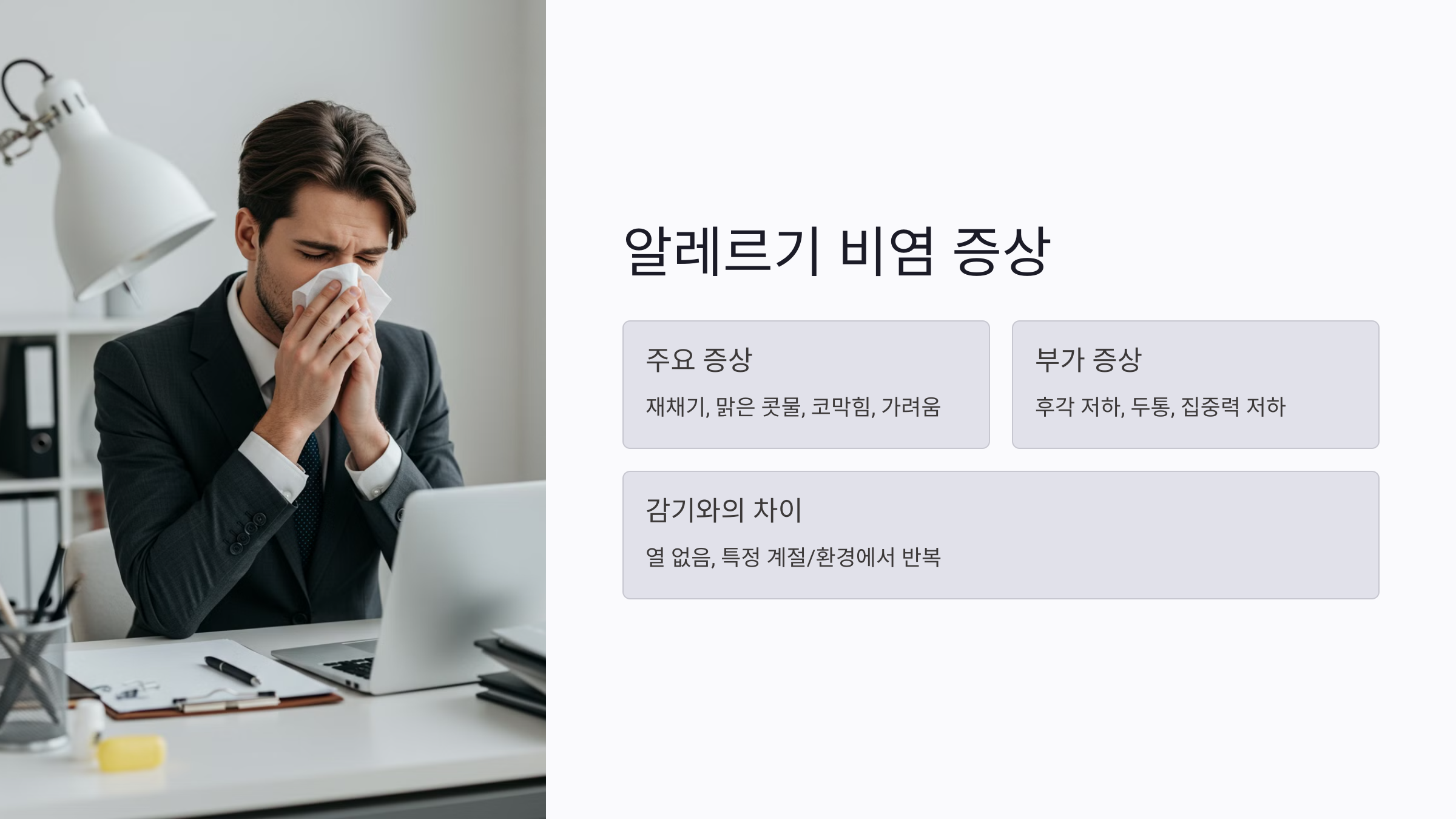 감기와는 달리 열이 나지 않으며, 특정 계절이나 환경에서 증상이 반복적으로 나타나는 경우가 많습니다.