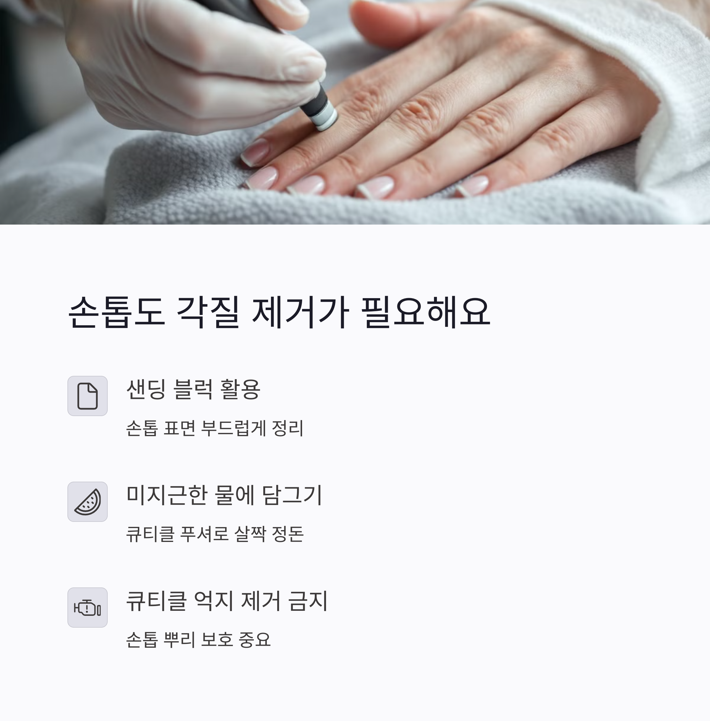 - 거칠어진 큐티클은 미지근한 물에 담근 후 푸셔로 살짝 밀어 정돈
