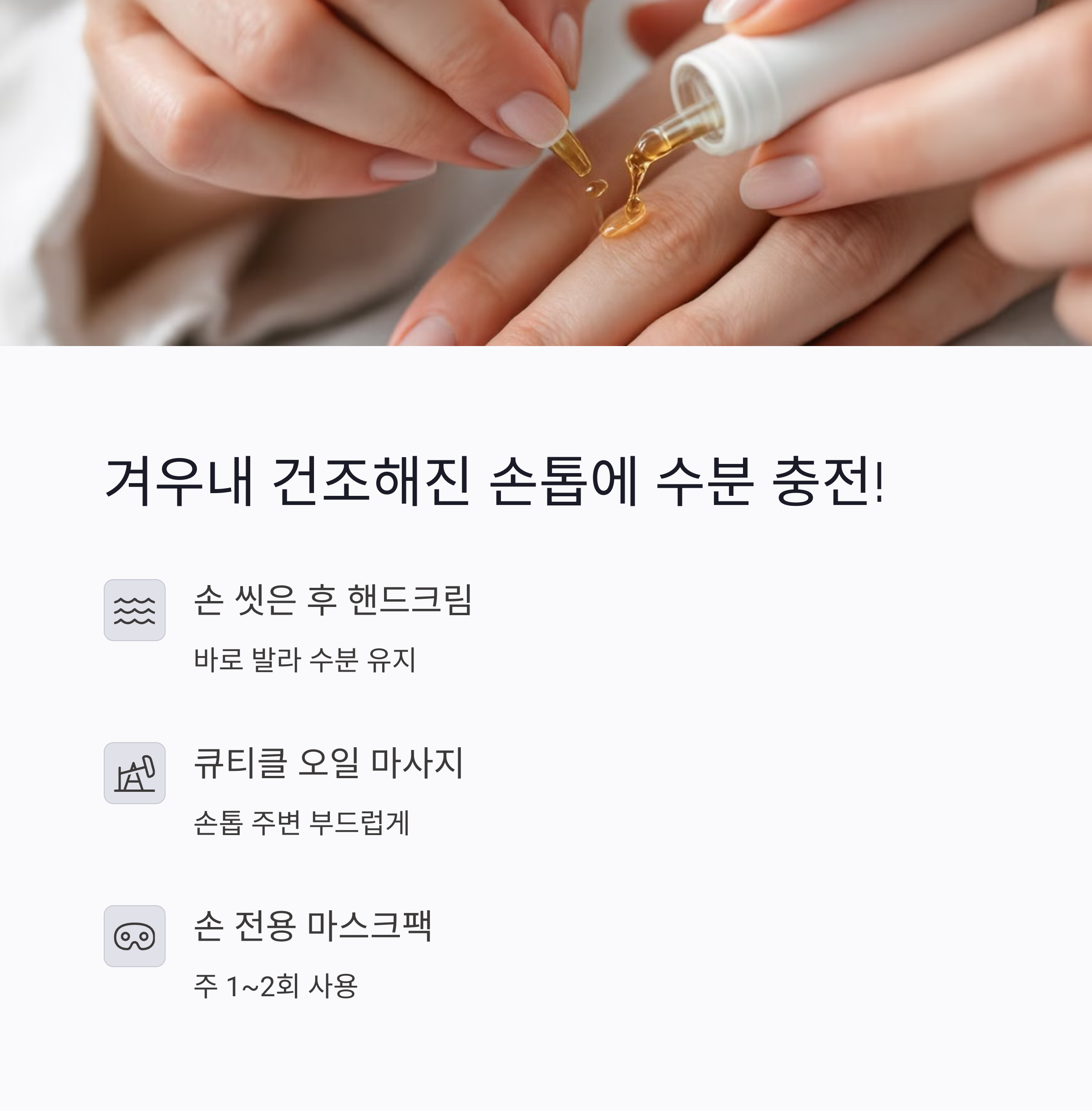 - 손톱 주변 큐티클 오일로 부드럽게 마사지